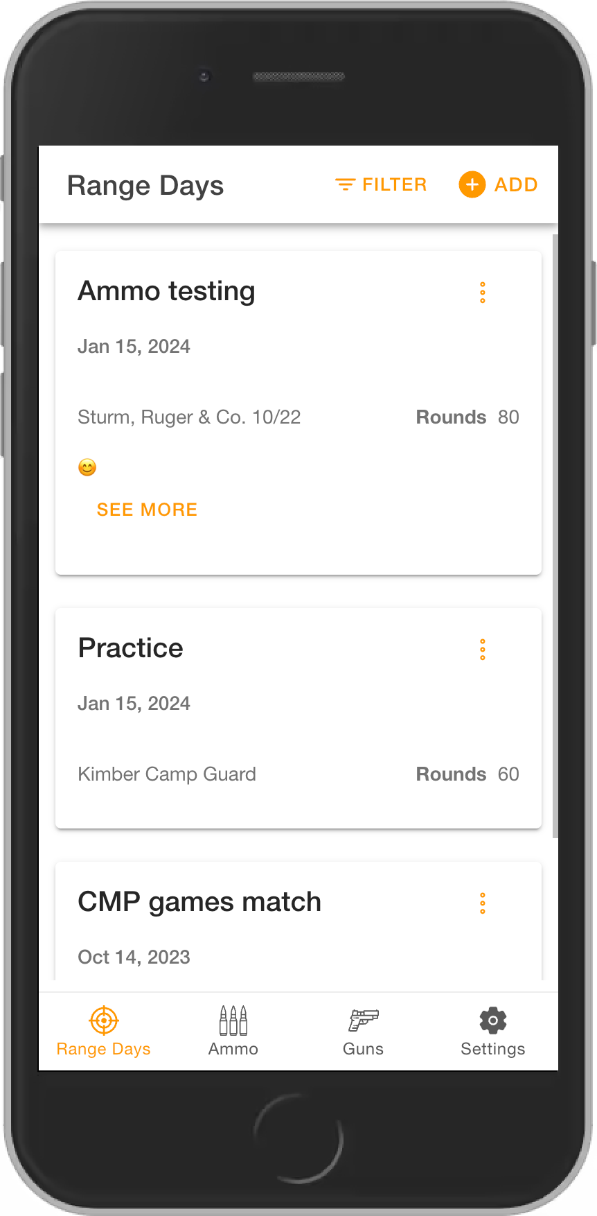 Get an overview of all your range days or dive deep into specifics by filtering by gun, date, or custom labels.